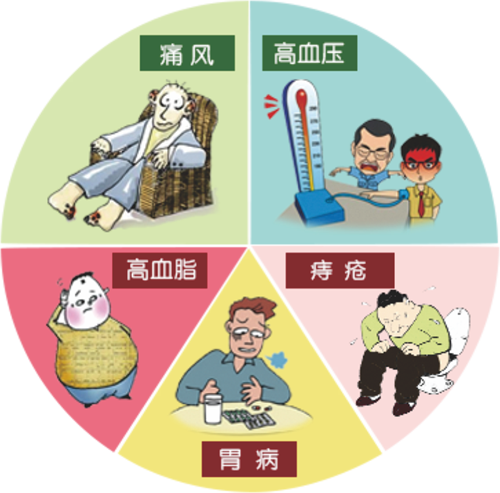 性功能低下、風(fēng)濕、肥胖、高血脂、高血壓、高膽固醇、高血糖、胃酸、胃脹、痔瘡、腎結(jié)石、腎乳鈣癥、頭痛、痛經(jīng)、胰腺炎、冠心病、癌癥、老年癡呆等